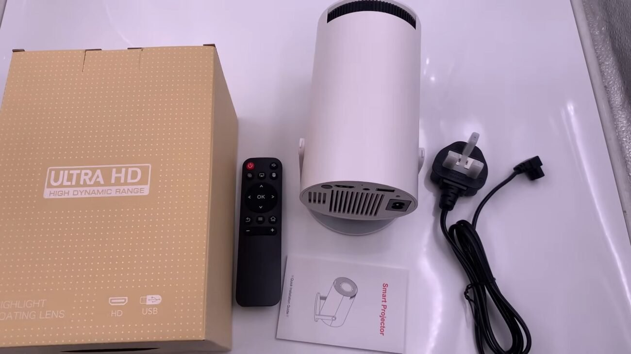 L’emballage contient l’essentiel : le projecteur, une télécommande, un câble d’alimentation, un manuel d’utilisation et un câble HDMI.